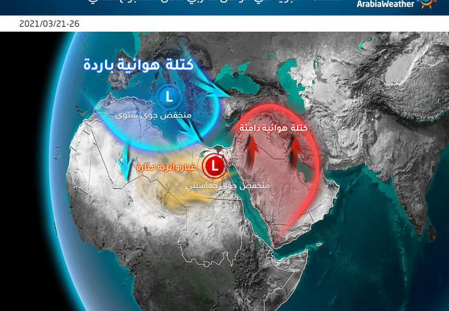اعتبار من الأربعاء تدفع نحو شمال السعودية والعراق كتلة هوائية باردة قادمة عبر البحر المتوسط وبلاد الشام، حيث تنخفض درجات الحرارة مجددا، وتستمر مرتفعة في كل من الكويت والبحرين وقطر والامارات وعمان حتى يوم الجمعة.