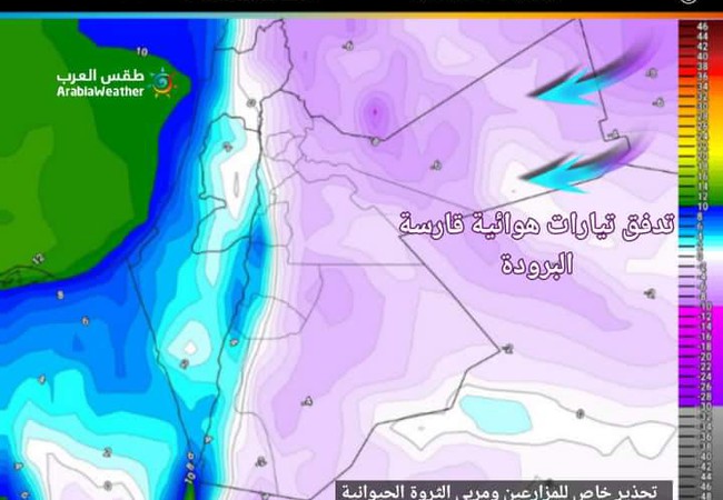 بحيث يتوقع ان تنخفض درجات الحرارة بشكل كبير وواضح تكون دون الصفر المئوي في أجزاء واسعة من المملكة وتصل بحدود -6 درجات مئوية تحت الصفر في شرق المملكة و -2/-3 درجة مئوية في العاصمة عمّان مع تشكل واسع النطاق للجليد والأنجماد اعتبارًا من ساعات المساء والليل الأولى فوق المرتفعات يمتد ليشمل معظم مناطق المملكة خلال دخولنا اكثر في ساعات الليل بأستثناء البحر الميت والعقبة ولايستبعد ان يطال الأغوار ويتوقع تساقط زخات ثلجية وامطار متجمدة في مناطق عشوائية من المملكة بالاخص المرتفعات الجبلية العالية الجنوبية.