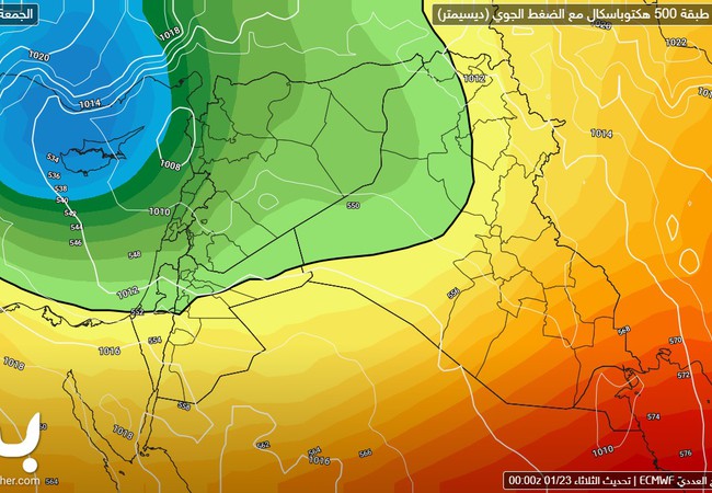 أما يوم الجمعة، تندفع إلى المنطقة كُتلة هوائية شديدة البرودة و قطبية المنشأ تؤدي إلى تشكل مُنخفض جوي إلى الشرق من جزيرة قبرص يؤثر على المملكة تدريجياً نهار الجمعة
