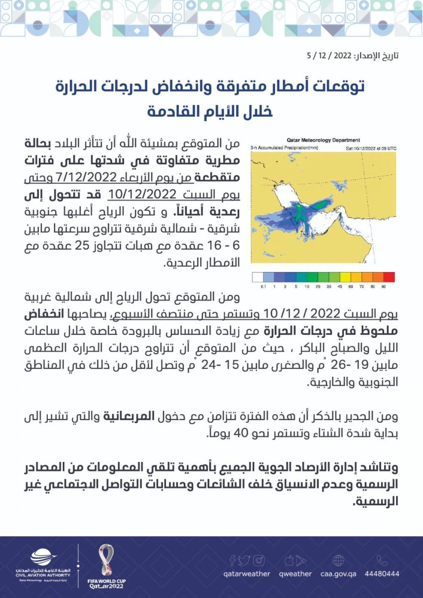 طقس العرب - أصدرت إدارة الأرصاد الجوية في الادارة العامة للطيران المدني في دولة قطر تقريراً جوياً يُفيد بتأثر قطر بحالة مطرية متفاوتة الشدة الأيام القادمة وتالياً التقرير.