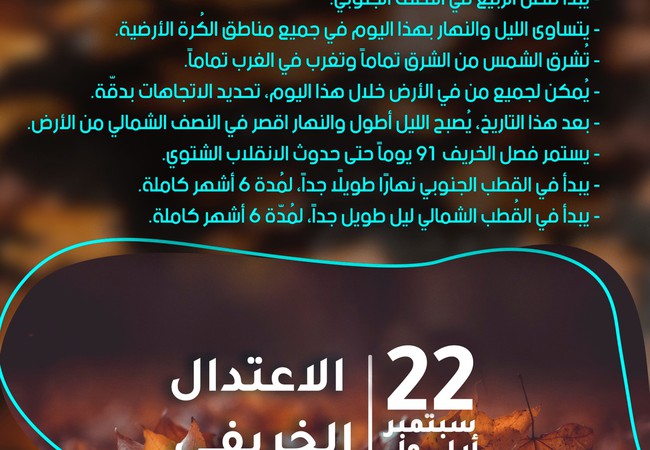 - يبدأ فصل الخريف "فلكياً" في النصف الشمالي من الكُرة الأرضية، بينما يبدأ فصل الربيع في النصف الجنوبي.