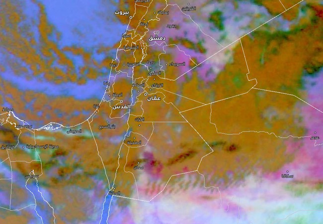 طقس العرب - تظهر صور الأقمار في طقس العرب، تشكل موجات غبارية قوية في بعض المناطق الصحراوية ومناطق البادية في هذه الأثناء بفعل هبات الرياح القوية والتي تقارب 100 كم/ساعة.