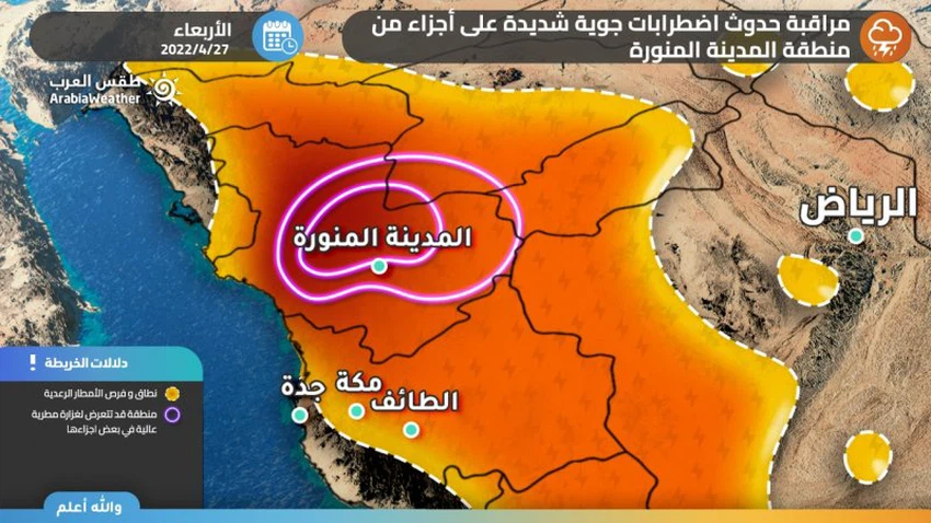 وبحسب آخر القراءات الجوية فيُتوقع أن تبدأ الإضطرابات الجوية فجر وصباح الأربعاء 27-04-2022 على المُرتفعات الغربية من المدينة المُنورة، وتتسع تدريجياً رُقعة الإضطرابات الجوية في منطقة المدينة المُنورة خاصةً المُرتفعات الغربية منها مع وجود فرصة لإمتداد بعض السُحب الممطرة لبعض المناطق الساحلية من المدينة المُنورة، وبالإتجاه نحو ساعات الظهيرة ونتيجة التسخين الشمسي الذي يعمل كعامل إضافي لتحفيز رفع السُحب الممطرة يتزايد تأثر منطقة المدينة المُنورة على وجهِ الخُصوص بالأحوال الجوية غير المُستقرة وينتج عن ذلك إشتداد كثافة السُحب وتكون ذو إمتداد رأسي، وتشمل فُرص الأمطار العديد من مناطق المدينة المُنورة بما في ذلك المدينة ذاتها، مع بقاء الفرصة واردة لإمتداد بعض السُحب المُمطرة لسواحلها وقد تُطال ينبع و رابغ ولا يُستبعد أن تُطال بعض السُحب المُمطرة شمال جدة.