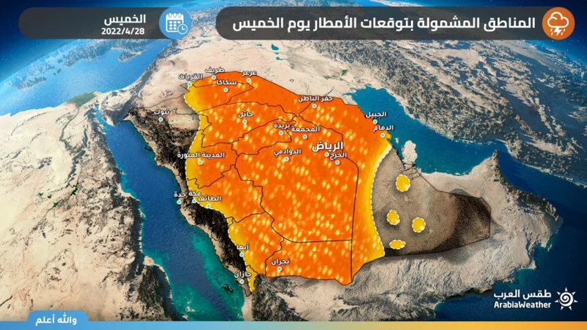 وبحسب التحليلات يُتوقع أن يتعمق المُنخفض الجوي في طبقات الجو العُليا أجواء المملكة يوم الخميس 28-4-2022، لتبلغ الحالة الماطرة ذُروة تأثيرها على المملكة، لتشمل الحالة الماطرة أجزاء واسعة من المملكة مُتمثلة بالقطاع الجنوبي والجنوبي الغربي من المملكة أي نجران وجازان وعسير والباحة ومكة المكرمة وخاصةً السُفوح الشرقية من هذه المناطق كما قد تمتد فُرص الأمطار للمشاعر المُقدسة، كما تشمل فُرص الأمطار الأجزاء الجنوبية والشرقية من المدينة المُنورة، وحائل والقصيم والحدود الشمالية والجوف وأجزاء من الشرقية خاصةً القسم الشمالي منه بما في ذلك حفر الباطن، ومنطقة الرياض إدارياً وتشمل العاصمة، وأجزاء من جنوب شرق تبوك نواحي محافظة تيماء.