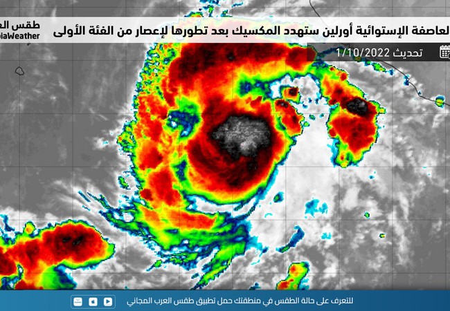طقس العرب - ترصد صور الأقمار الإصطناعية في مركز طقس العرب الإقليمي تشكل عاصفة استوائية فوق مياه شرق المحيط الهادئ بالقرب من شواطئ المكسيك الغربية بقيم ضغط جوي تبلغ 994مليبار وسرعة رياح تفوق ال105كم/ساعة واطلق عليها أسم أورلين.