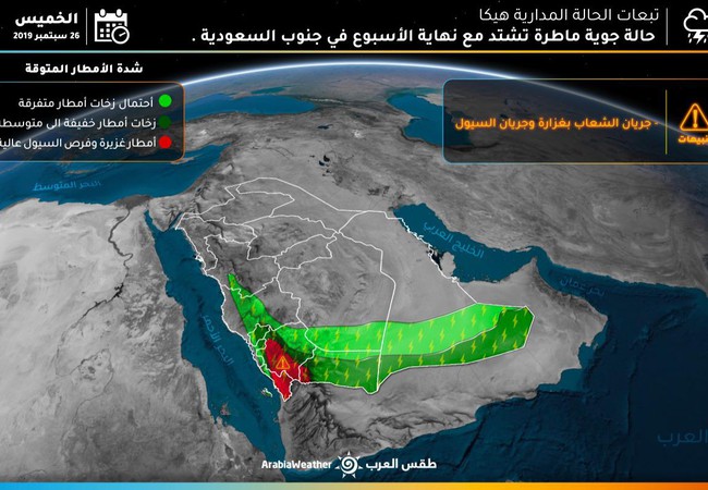 طقس العرب – م. ناصر حداد – تشير التوقعات الى تشكل حالة جوية ماطرة تشمل مناطق عديدة من جنوب وغرب السعودية، تبدأ الأربعاء 25 سبتمبر وتشتد مع نهاية الأسبوع بمشيئة الله.
