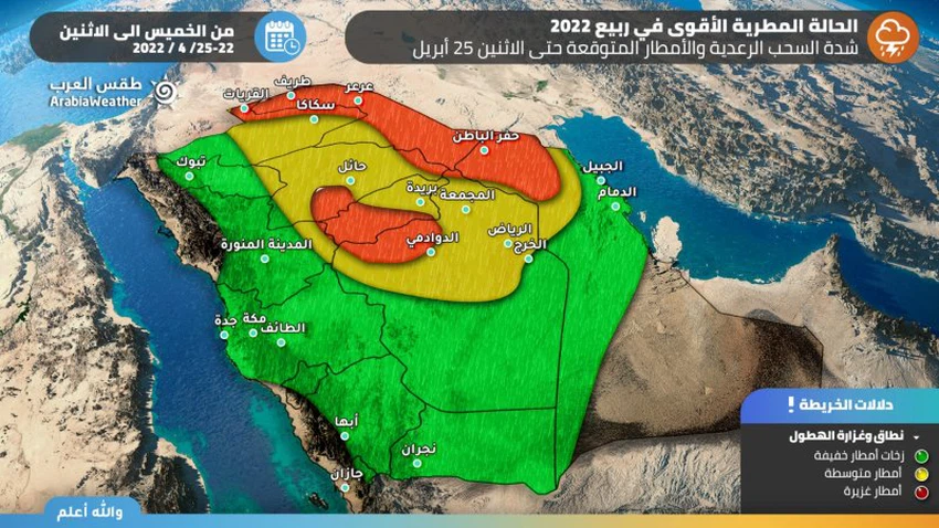 طقس العرب - أفاد المُختصون في قسم العمليات الجوية في مركز طقس العرب الإقليمي للأرصاد والتنبؤات الجوية إلى توقعات بإشتداد حِدّة الحالة الماطرة على المملكة السعودية وإتساع رُقعتها لتشمل مناطق جديدة خلال الأيام القادمة. وبحسب المركز فإنه يُتوقع بمشيئة الله أن تنكسر حالة الإنحباس المطري التي شهدتها أغلب مناطق المملكة خلال الشتاء المُنصرم، حيثُ تعتبر الحالة الماطرة المؤثرة على المملكة بمثابة إنقاذ الموسم المطري.