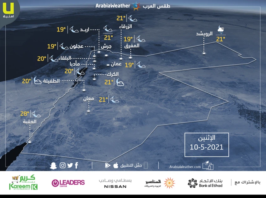 حالة الطقس ودرجات الحرارة المتوقعة في الأردن يوم الإثنين 10-5-2021