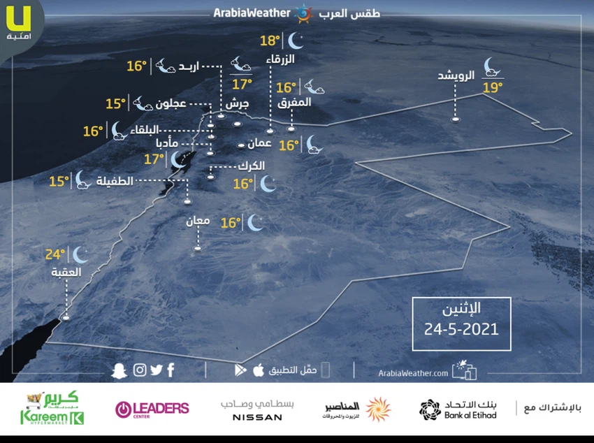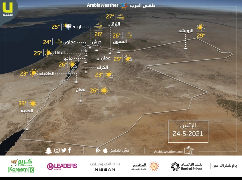 حالة الطقس ودرجات الحرارة المتوقعة في الأردن يوم الإثنين 24-5-2021