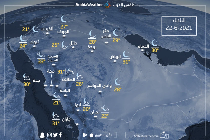 حالة الطقس ودرجات الحرارة المتوقعة في السعودية يوم الثلاثاء 22-6-2021