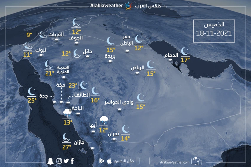 حالة الطقس ودرجات الحرارة المتوقعة في السعودية يوم الجمعة 19-11-2021