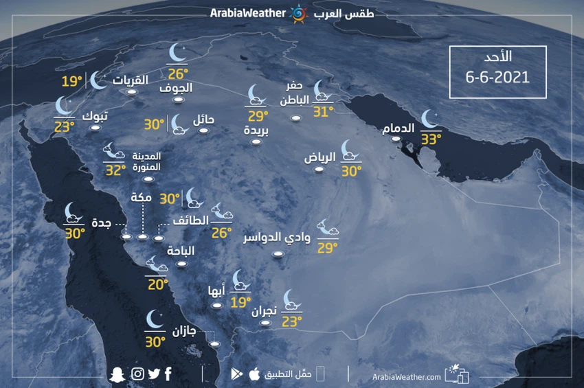حالة الطقس ودرجات الحرارة المُتوقعة في السعودية يوم الأحد 6-6-2021