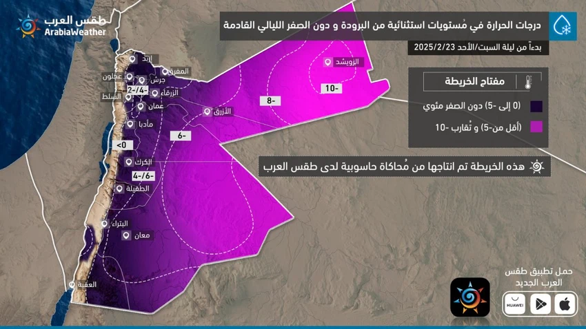 وعليه يتوقع أن توالي درجات الحرارة انخفاضها هذه الليلة وتنخفض بشكل إضافي مع ليلة الأحد/الاثنين وليلة الاثنين / الثلاثاء ، بحيث يتحول الطقس ليُصبح شديد الى قارص البرودة في غالبية المناطق، و تهبط درجات الحرارة لما دون الصفر المئوي بمناطق واسعة من المملكة وتالياً درجات الحرارة الصغرى المتوقعة في معظم محافظات المملكة خلال ال3 ايام القادمة :