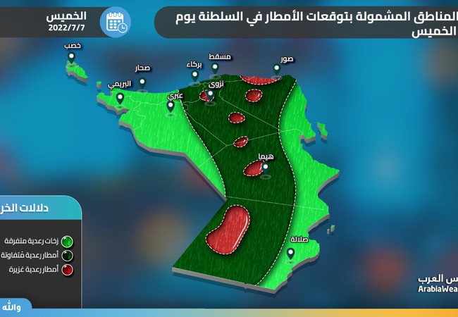 سلطنة عُمان | الحالة الماطرة تدخل في ذروتها و اتساع مساحة المناطق المشمولة بفُرص الأمطار الرعدية يوم الخميس 7-7-2022
