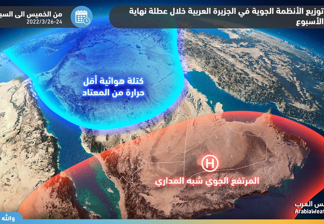 طقس العرب - تُشير خرائط النمذجة الحاسوبية الخاصة بتتبع الكُتلة الهوائية إلى توقعات بإندفاع كُتلة هوائية أقل حرارة من المُعتاد تندفع من الحوض الشرقي للبحر الأبيض المُتوسط وتتعمق تدريجياً لأجواء الجزيرة العربية، أما جنوباً فما زال المُرتفع الجوي شبه المداري باسط سيطرته على تلك المناطق فارضاً أجواء أكثر حرارة من المُعتاد بمشيئة الله.
