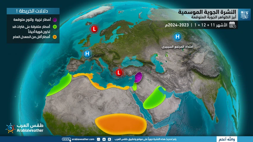 طقس العرب - يقدم لكم طقس العرب النشرة الجوية الموسمية المتوقعة للأشهر 11-12-1 (نوفمبر/ديسمبر/يناير) من عام 2023 و 2024، والتي تتضمن ما يلي: