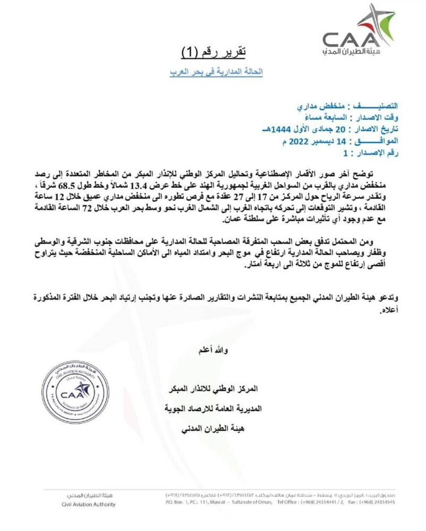 طقس العرب - سنان خلف - أصدرت الهيئة العامة للأرصاد الجوية في سلطنة عُمان التقرير رقم 1 حول تفاصيل الحالة المدارية في بحر العرب، وفيما يلي نص التقرير: