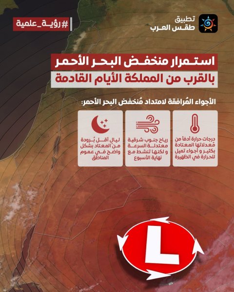 تطبيق طقس العرب - تُشير أحدث نواتج التنبؤات الحاسوبية توقعات بأن تبقى الأردن تحت تأثير ما يُسمى بمُنخفض البحر الأحمر و هو مُنخفض جوي سطحي ينشط في الفصول الانتقالية بما في ذلك فصل الخريف، و يُتوقع أن يبقى هذا المُنخفض بالقرب من المملكة خلال الأيام القادمة و يترافق بـ 3 أمور رئيسية في الحالة الجوية تتلخص كالتالي: