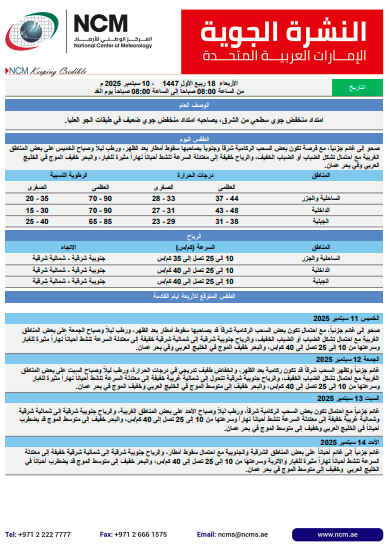 وتشير التوقعات إلى تشكل سحب على ارتفاعات منخفضة ومتوسطة وعالية، مع تفاوت في كثافة السحب بين فترة وأخرى، وتترافق الرطوبة المدارية مع فرصة لهطول زخات متفرقة من الأمطار، قد تكون رعدية أحياناً، على مناطق متفرقة من الدولة، مع تركيز أكبر لهذه الأمطار على المناطق الشرقية للإمارات.