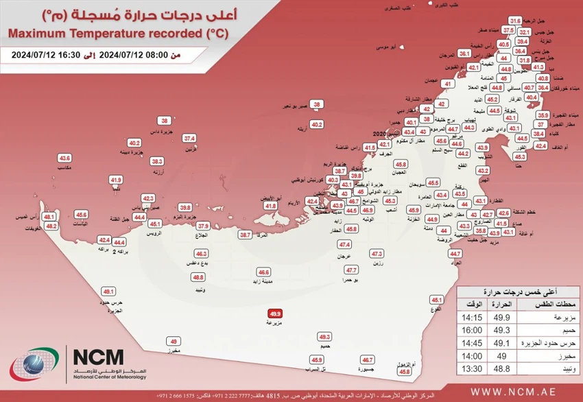 طقس العرب - بحسب التقرير الصادر عن الأرصاد الجوية الإماراتية اليوم الجمعة 12-7-2024 ، سجلت المزيرعة في منطقة الظفرة أعلى درجة حرارة على مستوى الدولة بدرجة حرارة بلغت 49.9ْ درجة مئوية.