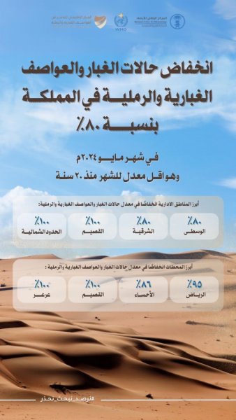 وأشار القحطاني إلى أن معدل حالات الغبار والعواصف الغبارية والرملية قد انخفض في مدينة الرياض بنسبة 95%، وفي الأحساء بنسبة 86%، وفي القصيم وعرعر بنسبة 100%.