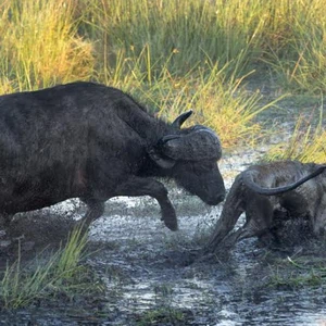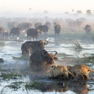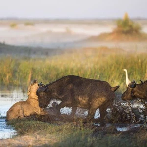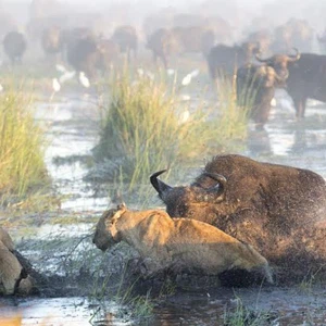 و في هذا الإطار و بحسب الصحيفة درات معركة طاحنة إختلطت فيها الدماء بطين المستنقعات بين مجموعة من الأسود و قطيع من الجواميس تجمعوا صفآ واحدآ مع الجاموس الأم ، و يقول المصور بن كرانك خرج مجموعة الأسود صفر اليدين بدون أي فريسة و أنتصرت مجموعة الجواميس بلنهاية.