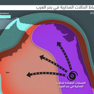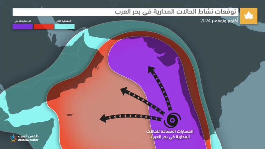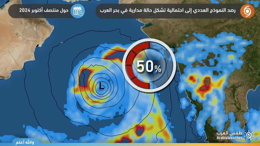 من مركز طقس العرب - ترصد خرائط عددية عالمية ناتجة عن ما يُسمى بالمُحاكاة الحاسوبية بما في ذلك النموذج العددي الأوربي المُعتمد على الذكاء الاصطناعي إلى احتمالية تشكل حالة مدارية شرق بحر العرب حول منتصف شهر أكتوبر، حيث بدأت فترة الاضطراب الموسمية الثانية في بحر العرب و التي تستمر شهري أكتوبر و نوفمبر و تعرف بالموسم الذي يليّ نشاط الرياح الموسمية في بحر العرب.