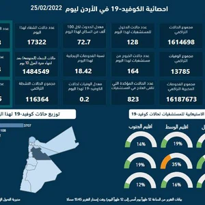 طقس العرب - أصدرت وزارة الصحة الأردنية تقرير كورونا اليومي لليوم الجمعة والذي يشير إلى تسجيل 7861 إصابة جديدة بفايروس كورونا و18 حالة وفاة ، أما نسبة الفحوصات الإيجابية فبلغت 18.42 %