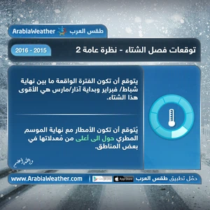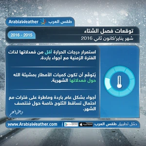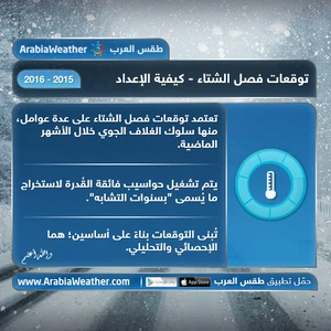 موقع ArabiaWeather.com -يُقدّم لكُم "طقس العرب" توقُعاته الموسمية لفصل الشتاء 2015/2016، علماً بأن هذه النشرة الصادرة الآن هي التحديث الأول فحسب، حيثُ أن التوقعات الموسمية قابلة للتغيير وسيتم إصدار عدّة تحديثات إن اقتضي الأمر، وينوه طقس العرب على انخفاض دقّة مثل هذه النشرات الجويّة بفعل طول الفترة الزمنية التي تشملها.