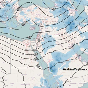 وتظهر الخريطتين التاليتين توزيع الاحواض الجوية العلوية في طبقة 500 هكتوباسكال والمناطق المتوقع تساقط زخات الأمطار عليها،