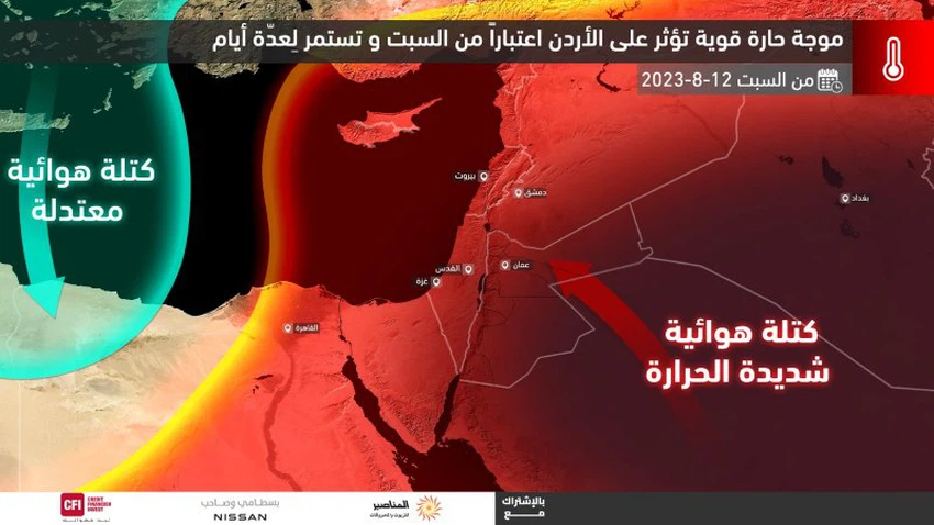 طقس العرب - يُتابع المُختصون في مركز طقس العرب الإقليمي عن كثب نواتج المُحاكاة الحاسوبية لحركة كُتلة هوائية شديدة الحرارة يُتوقع أن تندفع لبلاد الشام بما فيها المملكة اعتباراً من السبت القادم 12-8-2022 بإذن الله، و التي نستطيع تسميتها بـِ "الموجة الحارة" نظراً لتوقعات بإستمرارها لِعدّة أيام و كذلك تطرّف درجات الحرارة بعيداً عن مُعدلاتها المُعتادة بأكثر من خمس درجات مئوية.