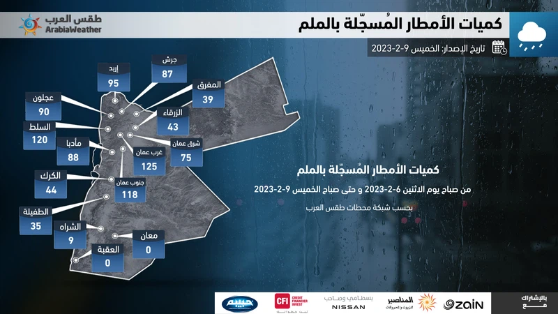 حظيت المناطق الشمالية تحديداً محافظة عجلون إضافةً للمناطق الوسطى بما فيها العاصمة عمان بكميات جيدة وكبيرة من الأمطار، حيث سُجلت أكثر من 100ملم من الهطول في عدة مناطق، وأداء الموسم المطري بات بخير و لله الحمد..