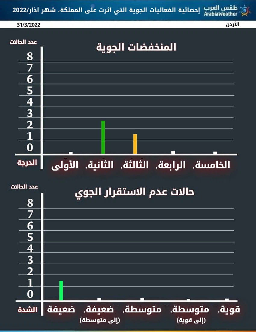 تاليًا ملخص الفعاليات الجوية التي أثرت على المملكة خلال شهر آذار/2022 :