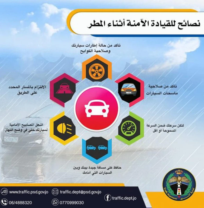 طقس العرب - تدعو إدارة السير الإخوة السائقين إلى ضرورة أخذ أقصى درجات الحيطة والحذر أثناء القيادة نتيجة الأحوال الجوية السائدة وتدني مدى الرؤية الأفقية نتيجة تشكل الضباب في عدد من المناطق وخاصة طريق مطار الملكة علياء الدولي.