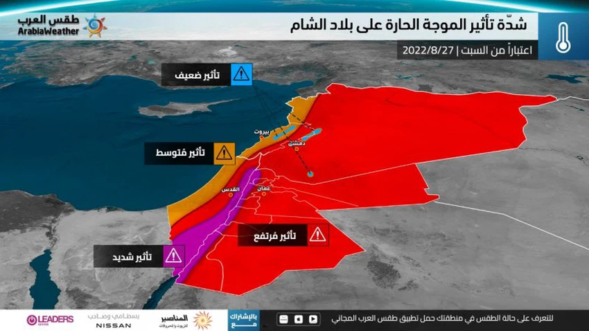 طقس العرب - تُشير الخرائط الجوية عبر نماذج مُحاكاة خاصة لتحركات الكتل الهوائية بأنه يُتوقع استمرار توضّع الكُتلة الهوائية الحارة والقادمة من صحراء شبه الجزيرة العربية فوق بلاد الشام والمملكة، وينتج عن ذلك استمرار تأثر المملكة بالتأثير المُرتفع للموجة الحارة خلال الأيام القادمة، ويزيد طول فترة تأثير الموجة الحارة عادةً من كيفية شعور الإنسان بها فتُصبح الأجواء مُرهقة ومُتعبة أكثر وخاصةً فيما إذا تزامنت مع ارتفاع كبير في درجات الحرارة الليلية.