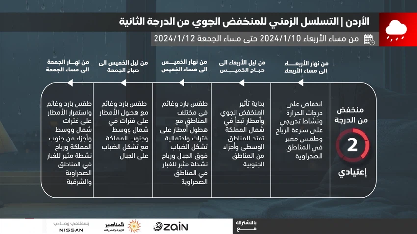 طقس العرب - تتأثر المملكة تدريجياً اعتباراً من مساء يوم الأربعاء ولعدة أيام، بمنخفض جوي مصحوب بكتلة هوائية باردة تم تصنيفه بحسب مؤشر شدة المنخفضات الجوية في مركز "طقس العرب"، على أنه من الدرجة الثانية الاعتيادية، وتالياً التسلسل الزمني للمنخفض الجوي: