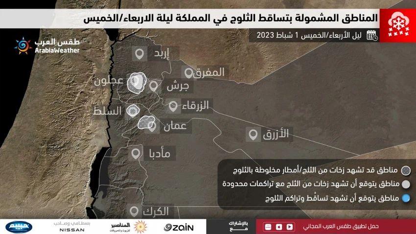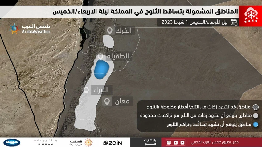 وتندفع خلال ساعات ليل الأربعاء/الخميس رياح شديدة البرودة في مُختلف طبقات الغلاف الجوي حيث تتهيأ الفُرصة لتساقط زخات من الثلوج على فترات فوق المرتفعات الجبلية الشمالية العالية التي يزيد ارتفاعها عن 1200 متر وتشمل قمم رأس منيف في محافظة عجلون، اضافةً الى مرتفعات جنوب المملكة وتشمل مرتفعات الرشادية والقادسية في مُحافظة الطفيلة اضافةً الى الى قمم لواء الشوبك والهيشة ورأس النقب و المناطق المحيطة في بوادي موسى.
