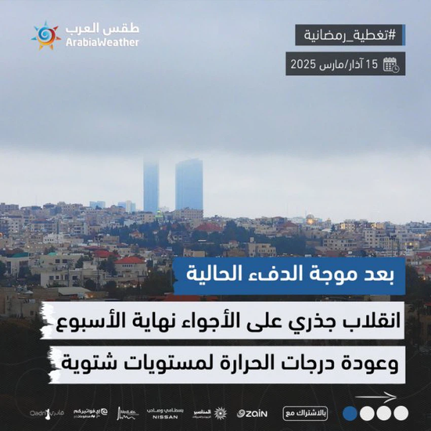 الاثنين والثلاثاء 17-18-3-2025: تبقى درجات الحرارة أدفأ من المعتاد بحدود 10-12 درجة مئوية. ويكون الطقس ربيعيًا دافئًا في مختلف المناطق ويميل للحرارة مع ساعات العصر، ويكون الطقس حارًا في الأغوار والبحر الميت والعقبة، مع ظهور السحب المرتفعة.