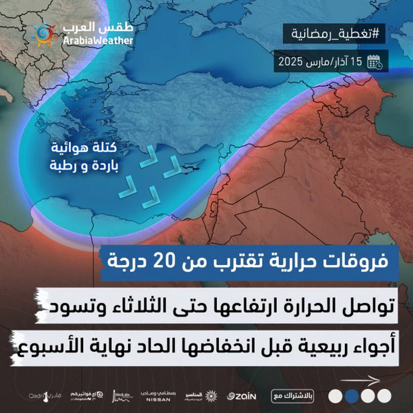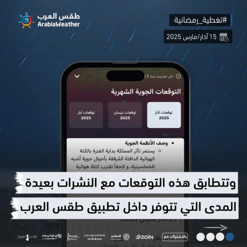 الأمطار حاضرة باذن الله نهاية الأسبوع: ويتم مراقبة احتمالية تشكل منخفض جوي يجلب الهطولات المطرية نهاية الأسبوع وتتطابق هذه التوقعات مع النشرات بعيدة المدى التي تتوفر داخل تطبيق طقس العرب.