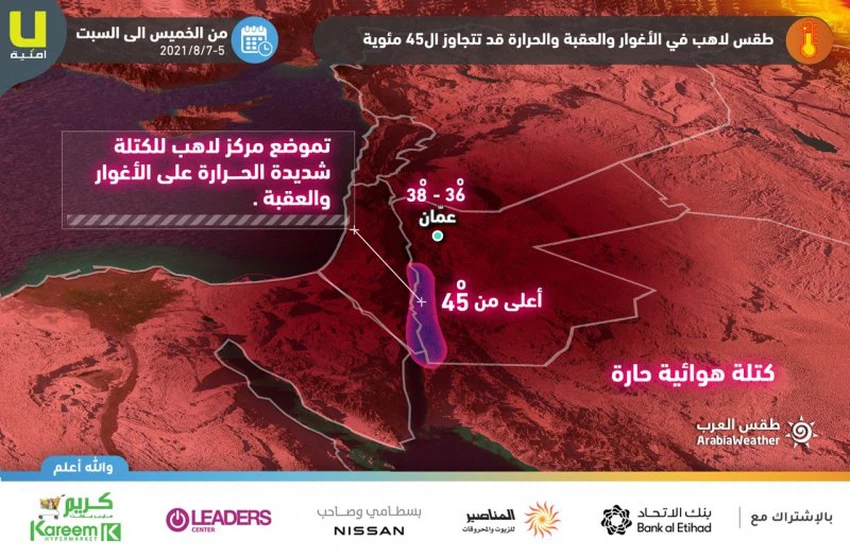 طقس العرب - بالرغم من التأثير العادي للكتلة الهوائية الحارة على معظم مناطق المملكة، إلا أن آخر مُخرجات النماذج العددية الحاسوبية المُشغلة لدى قسم العمليات الجوية في شركة طقس العرب تشير إلى توقعات بتأثير شديد للكتلة الحارة على مناطق الأغوار الوسطى و الجنوبية بما فيها البحر الميت و غور الصافي بالإضافة إلى العقبة، حيث لا يُستبعد أن تتجاوز درجات الحرارة العظمى في بعض من تلك المناطق حاجز الـ 45 درجة مئوية، ويعود السبب في ذلك للطبيعة الجغرافية التي تمتع بها تلك المناطق، ومصدر وزاوية تأثير الكتلة الهوائية الحارة على المملكة، في حين يكون تأثير الكتلة الهوائية الحارة على باقي مناطق المملكة عادياً، وليس بالشدة المُتوقعة على الأغوار والعقبة.