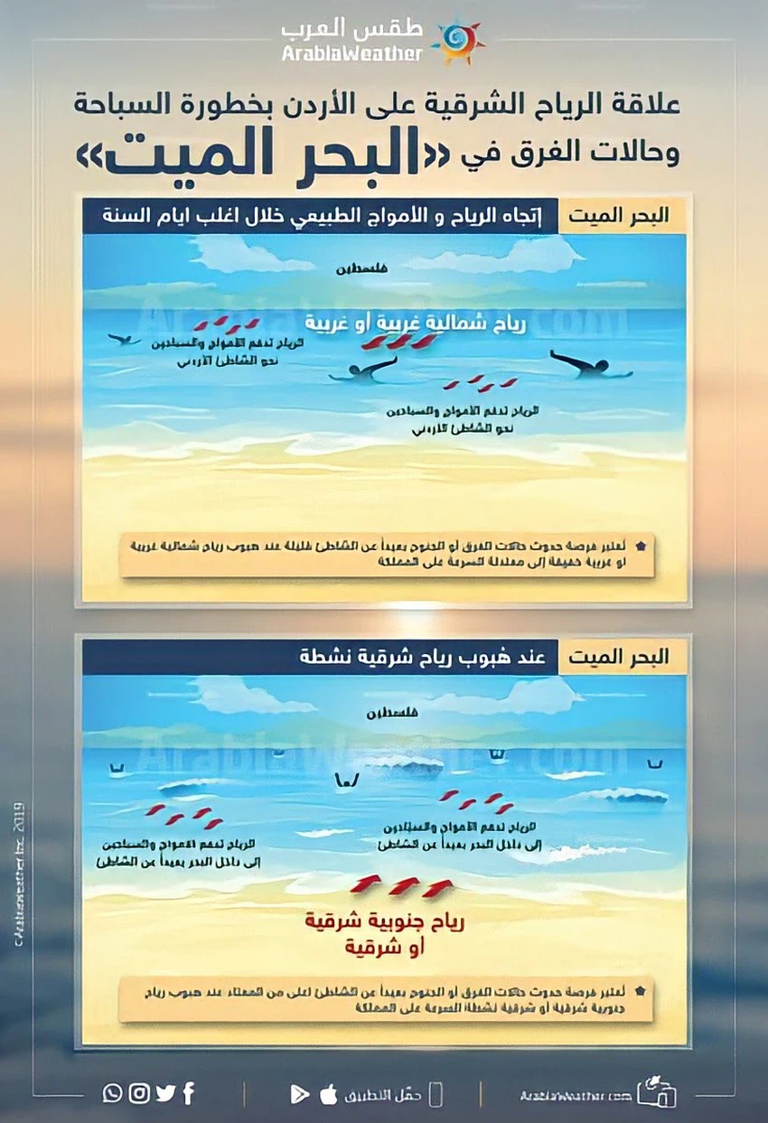 عادةً ما تكون الرياح التي تهب على الأردن قادمة من الإتجاه الشمال الغربي أو الغرب، وغالباً ما تكون ذات سرعة خفيفة إلى مُعتدلة. لذا، فإنها تدفع بالأمواج على مسطح البحر الميت الصغير بشكل خفيف إلى متوسط، ولهذا يندفع السّياح والسباحين إلى الشاطئ بشكل طبيعي وتدريجي دون مجهود كبير، كون الرياح تهب من خلفهم أي أنها قادمة من الغرب والشمال الغربي.