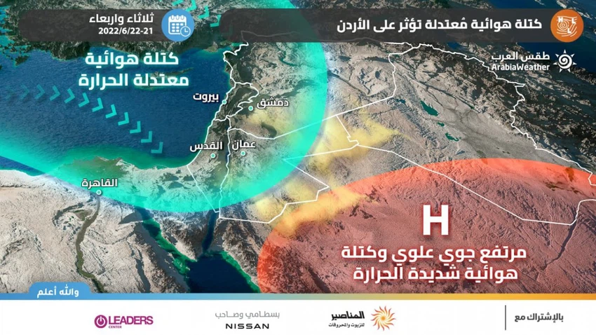 طقس العرب - تشير آخر مُخرجات النماذج العددية في مركز طقس العرب الإقليمي إلى تأثر المملكة يومي الثلاثاء والأربعاء بكتلة هوائية بحرية مُعتدلة الحرارة قادمة من البحر الأبيض المتوسط، لذا يطرأ انخفاض آخر على درجات الحرارة لتكون أقل من مُعدلاتها لمثل هذا الوقت من العام، ويكون الطقس مائلاً للبرودة صباحاً، يتحول إلى صيفي مُعتدل خلال ساعات الظهيرة والعصر في مُختلف مناطق المملكة، في حين يُصبح حاراً نسبياً في الأغوار والبحر الميت ومدينة العقبة.