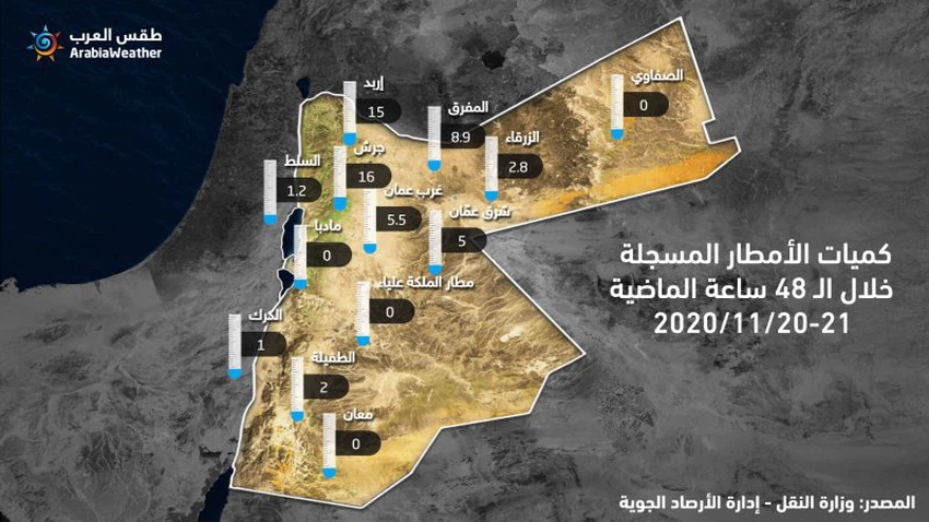 طقس العرب - أثرت على الأردن خلال عطلة نهاية الأسبوع حالة من عدم الاستقرار الجوي والتي هطلت على إثرها الأمطار في أجزاء مختلفة من المملكة، وتاليًا كميات الأمطار المسجلة خلال الـ 48 ساعة الماضية بحسب وزارة النقل - إدارة الأرصاد الجوية الأردنية: