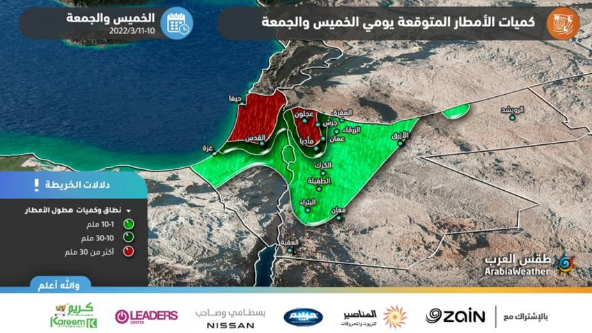 ومن المُنتظر ان تسجل المناطق الشمالية واجزاء من المنطقة الوسطى بما فيها غرب العاصمة عمان كميات أمطار حول الى اكثر من 30 ملم، بينما تتراوح كميات الأمطار في بقية المناطق مابين 1 الى 30 ملم إن شاء الله.