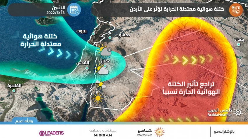 طقس العرب - تشير آخر مُخرجات النماذج العددية في مركز طقس العرب الإقليمي إلى تأثر المملكة يوم الاثنين بكتلة هوائية بحرية مُعتدلة الحرارة قادمة من البحر الأبيض المتوسط، لذا يطرأ انخفاض ملموس على درجات الحرارة يوم الاثنين لتكون أقل من مُعدلاتها لمثل هذا الوقت من العام، وبكون الطقس مائلاً للبرودة صباحاً، يتحول إلى مُعتدل خلال ساعات الظهيرة والعصر في مُختلف مناطق المملكة، في حين يُصبح حاراً نسبياً في الأغوار والبحر الميت ومدينة العقبة، تزامناً مع انتشار لكميات من الغيوم المُنخفضة خاصة في المناطق الشمالية والوسطى الغربية.