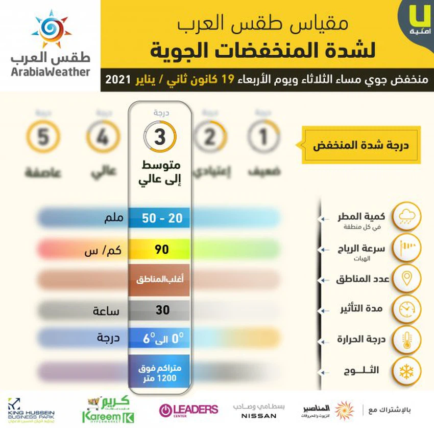 المنخفض الجوي المتوقع مصنف ضمن الدرجة الثالثة، وهي درجة المنخفض الجوي المتوسط إلى عالي الفعالية، تبدأ الجبهة الهوائية الباردة المرافقة للمنخفض الجوي بعبور المملكة مع ساعات عصر ومساء الثلاثاء، حيث تتكاثر الغيوم الماطرة شمالاً بالتزامن مع نشاط كبير في سرعة الرياح الجنوبية الغربية في عموم المناطق، ثم تشمل الأمطار لاحقا باقي مناطق المملكة قد تصل حتى العقبة بشدة خفيفة.