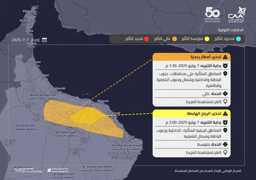 الأرصاد العُمانية تُصدر عدة تنبيهات محتملة لليوم الإثنين 7 يوليو 2025 وتشمل هذه المناطق