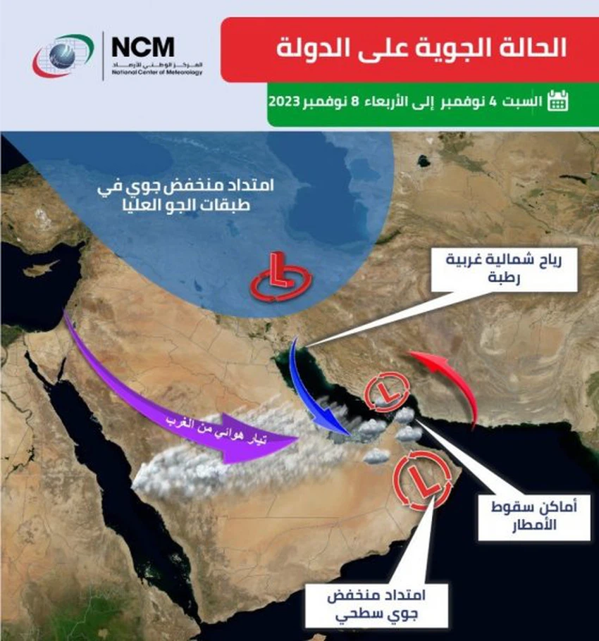 طقس العرب - أصدر المركز الوطني للأرصاد في الإمارات تقرير يتضمن حالة الطقس المُتوقعة خلال الأيام القادمة، و أشار التقرير توقعات بأن تتأثر الدولة بامتداد منخفض جوي سطحي من الشرق مع امتداد منخفض في طبقات الجو العليا يصاحبه تيار هوائي من الغرب و كتلة هوائية رطبة و باردة مع تدفق للسُحب من الغرب على فترات يتخللها بعض السُحب الركامية على مناطق مُتفرقة خاصة شرقاً و شمالاً يصاحبها هطول أمطار خفيفة إلى متوسطة قد تكون غزيرة على مناطق محدودة.