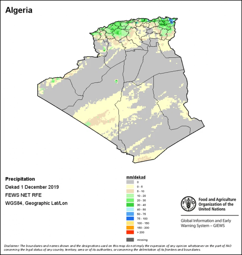 طقس العرب - نشرت منظمة الأغذية و الزراعة تقريرها الشهري للأداء المطري في الجزائر حيث يتبيّن أن الأمطار كانت اعلى من معدلاتها في مختلف المناطق الشمالية الغربية و الوسطى و الشرقية، لكن كان الأداء الافضل للمناطق الشرقية و ايضا الوسط الغربي ( ولايات تيارت - تيسمسيلت - عين الدفلى - شلف و تيبازة ).