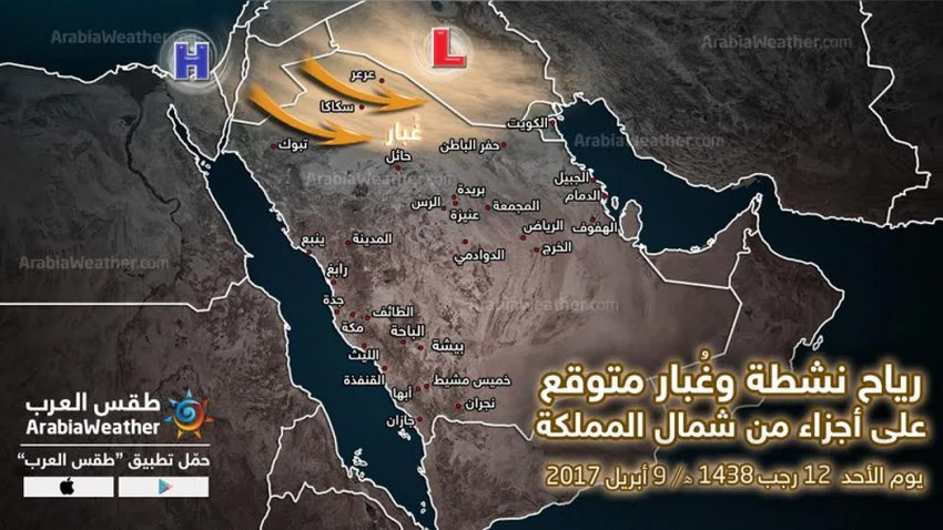 موقع ArabiaWether.com - سنان خلف من المُتوقع بمشيئة الله أن تتأثر مناطق الجوف والحدود الشمالية نهار غدٍ الأحد برياح غربية نشطة مع هبات قوية أحياناً، يُتوقع أن تثير موجة كبيرة من الأتربة والغبار.